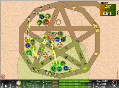 수많은 '디펜스' 게임 중 이녀석이 돋보이는 것은, '콤보'의 존재입니다. 건물들을 일정한 법칙에 맞춰 서로 근처에 지으면, 혼자서는 쏠 수 없던 강력하고 화려한 공격이 나가죠. 여기까지는 좋습니다. 문제는 '콤보'에 사용될 모든 건물들의 '공격력'을 풀 업해야 한다는 것.