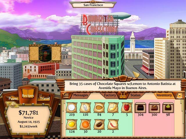 제작은 공장에서 자동으로 해주는데, 단 초콜렛의 레시피마다 1주에 생산될 수 있는 양을 미리 정해줘야 합니다. 어떻게? [주마(Zuma)] 류의 미니 게임을 통해. 초콜렛을 만드는 틀에 플레이어가 재료를 쏴 넣어 완성하면 점수가 올라가고, 1분간 따낸 점수가 1주일간 생산 가능한 양이 됩니다. 쉽고 간단한 게임이지만, 신경 바짝 차리지 않으면 고득점내기 힘들기 때문에, 의외로 난이도가 좀 있는데요. 단순히 생산량을 '숫자'로 따지는게 아니라, 플레이어의 솜씨를 뽐내는 참여를 시킨다는 점에서, 꽤 재미있는 시도가 아닌가 싶습니다. 제작은 생산량만 이렇게 정해주고 재료만 사주면 알아서 뽑아내지만, 재료가 떨어지면 당연히 공장도 쉽니다. 즉 여기 저기 오가며 무역 하면서도, 재료 떨어지지 않게 신경써서 잘 사줘야 해요.