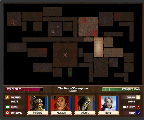 던젼 RPG이긴 하지만 [넷핵(Nethack)]처럼 복잡하지는 않아서, 대충 정해진 캐릭터들과 진행하게 되는데요. 스탯이나 기술의 분기 등의 요소는 있지만 정통 던젼 RPG만큼 복잡하지는 않아서, 그리 머리 아프지 않게 진행할 수 있습니다. 조작도 키보드를 쓰지 않고 마우스 클릭만으로 진행하기 때문에, 던젼 RPG의 깊이 비슷한 것을 단순한 조작으로 즐길 수 있죠. 레벨도 경험치를 쌓는 식이 아니고, 한 층 내려갈때마다 함께 저절로 올라가기 때문에, 고득점이나 아이템을 노리지 않는다면 굳이 모든 적과 싸워야 할 필요도 없음.