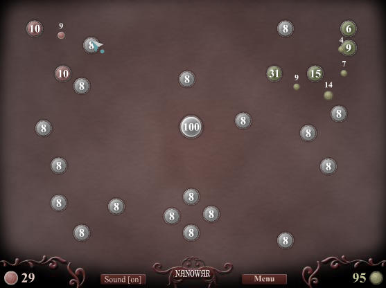 하지만 가장 큰 차이점은, [갈콘]에서는 오가는 유닛들이 중간에서 만나도 아무런 일이 없었던 반면, 이 게임 [나노 워(Nano War)]에서는 상호작용이 발생하며 뺄셈이 발생한다는 것입니다. [갈콘]에서는 상대방의 행성에만 영향을 미칠 뿐 공간에서는 아무 일이 없어서 그걸 이용한 '빈집털이' 등이 가능했고, 또한 옆 행성에서 중간에 막아주거나 하는 일이 전혀 불가능했는데요. [나노 워]는 그게 가능해진 덕분에, 게임의 진행이 묘하게 달라졌습니다.