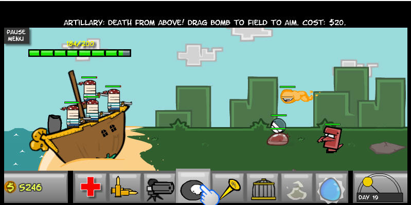 인터페이스가 약간은 포인트 & 클릭(Point & Click) 어드벤쳐를 연상시키기도 합니다. 아래 메뉴에서 아이템을 골라 클릭한 후, 해당 아이템이 공격할 수 있는 적에게 드랙하면 무찌르게 됩니다. 각 적들의 특성이 달라 다른 아이템을 사용해야 하고, 또한 아이템을 적용하는 방법도 조금씩 달라 불 & 물은 그냥 갖다 대고 / 못은 위에서 아래로 찍어 누르며 / 포탄은 발사 후 시간차를 두고 폭발합니다. 몇몇 적의 경우 주종목으로 사용하는 무기가 아니더라도 상대할 수 있기 때문에, 복합적인 플레이가 가능한 척 느끼게 해주는 것도 재미있는 부분입니다.