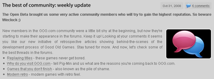제가 여기 오는 이유 중 대부분은 커뮤니티 때문입니다. 그 안에서 새로운 친구들을 만드는 것을 즐기죠. 여기 포럼은 일반적인 포럼들보다 훨씬 흥미롭습니다. "이 게임 언제 GOG에 올라오죠?" 식의 끝없는 뻘질문 빼면 말이죠... 매우 극소수의 트롤만 존재합니다.