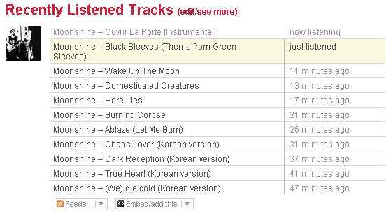 또한 저기 써있는 문샤인의 청취 횟수 거의 대부분이, 신보인 3집 [이터널(Eternal)] 이후에 생겼다는 것이 중요. 6월 초에 발매된 음반을 몰아들어 1 달 동안 저만큼 들었다는 얘기인데... 새로 들여온 음반이 맘에 들어도 1-2일 정도만 듣고, 많아봤자 1주일을 잘 넘기지 못하는데, 1달간 저렇게 듣고 듣고 또 들었다니... 개인적으로도 좀 놀라울 지경입니다.