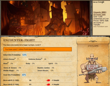 텍스트 기반으로 진행되지만, 어느정도의 그래픽이 첨가되어 있습니다. 다이스 굴리는 RPG 느낌을 주기 위해 전투 과정이 순차적으로 스크롤되며 출력되지만, 와닿는 것이 있는지 없는지도 잘 모르겠네요. 1회 움직일때마다 액션 포인트가 소비되고, 일정 시간 후에 리필이 되거나 / 돈 주고 추가 구매도 가능한데, 재미가 와닿지 않아서 사고 싶지도 않습니다. 레벨이 좀 올라가면 PvP나 협동도 가능할 듯 싶은데, 거기까진 가보지 않아 잘 모르겠군요.