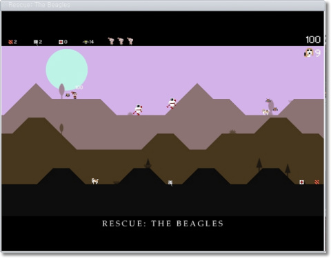 [레스큐 더 비글스(Rescue the beagles)]는 간단한 강제 스크롤 플렛 포머 게임으로서, 상 중 하로 나뉘는 세단계의 각기 다른 지형을 가지고 있다. 각 지형마다 등장하는 비글을 위 아래로 오가며 구출한다는 목적은 얼핏 간단해 보이지만, 빠르게 강제스크롤 되는 지형을 안전히 이동하는 것이 생각보다 쉽지 않다. 이를 위해 플레이어는 부엉이, 낙하산, 로프, 치료약과 같은 아이템이 준비되어 있으며, 플레이어는 이를 착실히 사용하여 위기를 벗어나야만 한다.